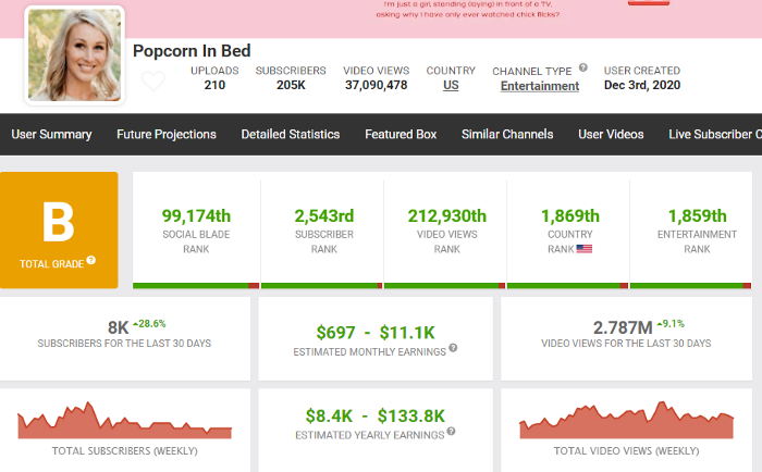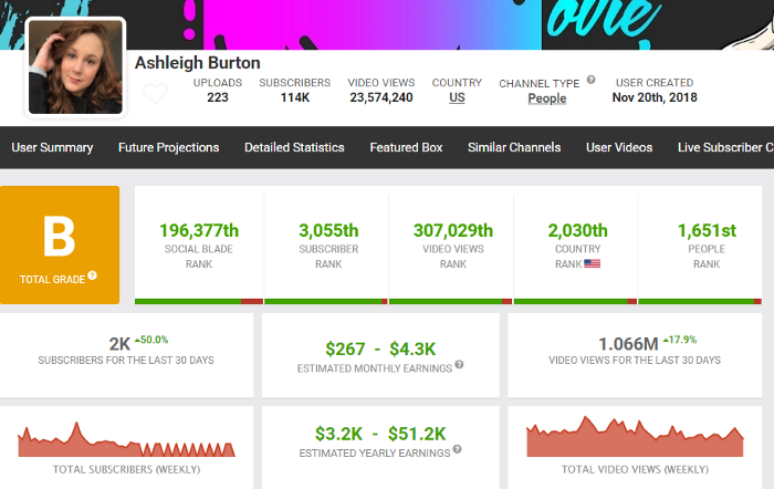 It’s even better if there’s a bit of a culture clash, or “fish out of water” angle in your reaction videos. Take Ashleigh Burton of Millennial Movie Monday, a “millennial who has been sheltered from every classic movie you can think of.” Ashley first started posting regularly in February, 2020, and offers lively reactions on her channel. Here’s a screenshot of her Social Blade details: