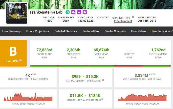 Frankenstein’s Lab is a real “workman’s” channel, having consistenty posted for almost five years now. It didn’t seem to benefit much from a “Covid Bump” in popularity. It was already well on its way before then. The two cousins have a small Patreon following. But they do utilize PayPal and CashApp, so it’s hard to say what their channel’s income might be. It obviously pulls in enough to be worth it to keep going.