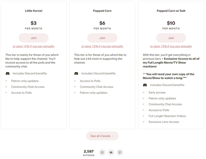 Patreon gives content creators a chance to earn an additional revenue stream by offering their fans a monthly membership. From what I found in my search, the most lucrative Patreon accounts offered exclusive perks, like behind-the-scenes insights, early access to new content, polls to vote on which movies to watch, or livestreams. Just looking at some of the Patreon accounts was very instructive. If you want the best results, you need to be active about not just producing new content regularly, but also building a community with your fans.