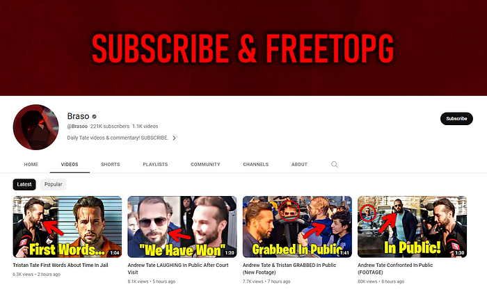 Braso uploads micro vids of and about Andrew Tate multiple times a day. As in about every 2–3 hours. In just the last 24 hours, the channel has put up 9 videos.