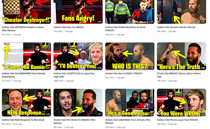 Thumbnails are clickbaity, emphasizing even the slightest bit of Tate news as ultra controversial. Often focusing on ONE particular news item or development.