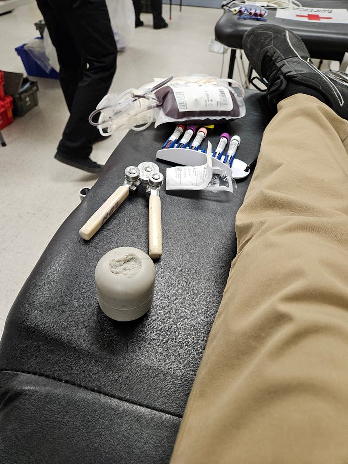 In my donation yesterday my vein was less cooperative than usual. Though it may have been a bad needle stick, too. In either case, a technician had to stand there and manually hold the syringe in place, sometimes moving it ever so slightly, in order to maintain my blood flow. A condition that would have been absolutely untenable for me previously when syringes filled me with wracking dread. Now it’s just more of an inconvenience.