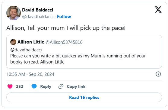 If you are a prolific writer, sometimes it’s not enough for fans. Baldacci recently had this exchange with a reader: